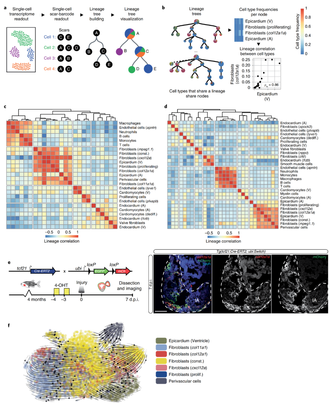 接下來,作者想要闡明短暫成纖維細(xì)胞狀態(tài)的起源,以便更好地理解它們的激活機(jī)制。于是作者使用了基于CRISPR-Cas9技術(shù)的大規(guī)模平行譜系追蹤方法LINNAEUS。這種方法將細(xì)胞通過可遺傳的DNA條形碼(遺傳疤痕)標(biāo)記,它們由Cas9在早期發(fā)育過程中產(chǎn)生,其獨(dú)特的序列能夠識別疤痕產(chǎn)生時(shí)來自同一親本的細(xì)胞。通過對同一個(gè)單細(xì)胞的遺傳疤痕和轉(zhuǎn)錄組進(jìn)行測序,作者便可以建立譜系樹,揭示這些細(xì)胞類型的共同發(fā)育起源(圖4a)。在譜系樹中,一個(gè)節(jié)點(diǎn)中的所有細(xì)胞共享相同的發(fā)育祖先(比如圖4a,B和C節(jié)點(diǎn)就共享相同發(fā)育祖先A),并且每個(gè)節(jié)點(diǎn)上不同瞬時(shí)細(xì)胞狀態(tài)下的每個(gè)細(xì)胞均可在相同的上一節(jié)點(diǎn)中對應(yīng)找到(比如在圖4a的譜系圖中節(jié)點(diǎn)C就包含了3種瞬時(shí)細(xì)胞狀態(tài),這三種狀態(tài)下的所有細(xì)胞均可以在上一節(jié)點(diǎn)的對應(yīng)細(xì)胞狀態(tài)中找到)。作者還計(jì)算了不同樹節(jié)點(diǎn)中細(xì)胞類型比率之間的相關(guān)性,以確定哪些細(xì)胞類型通過譜系相關(guān)聯(lián)(圖4b)。譜系相關(guān)性聚類熱圖顯示,在3 d.p.i.時(shí)有4簇細(xì)胞類型,在7 d.p.i.時(shí)有7簇細(xì)胞類型。在這兩個(gè)時(shí)間點(diǎn),所有的免疫細(xì)胞共享一個(gè)相同的譜系。此外,幾種成纖維細(xì)胞:col11a1a、col12a1a和構(gòu)成型成纖維細(xì)胞,它們和心外膜細(xì)胞聚集在一起,這表明這些成纖維細(xì)胞與心外膜細(xì)胞具有共同的發(fā)育起源(圖4c,d)。為了驗(yàn)證這一結(jié)論,作者又構(gòu)建了轉(zhuǎn)基因系TgBAC(tcf21:Cre-ERT2;ubi:Switch)。重組后,在7 d.p.i.表達(dá)的mCherry與內(nèi)源性表達(dá)的col12a1a共定位(圖4e),證實(shí)了瞬時(shí)col11a1a和col12a1a成纖維細(xì)胞為心外膜或心外膜衍生成纖維細(xì)胞的起源。為了進(jìn)一步闡明短暫心外膜成纖維細(xì)胞狀態(tài)的起源,作者應(yīng)用了RNA速度分析方法,對心外膜譜系簇中所有心室細(xì)胞類型在3 d.p.i.和7 d.p.i.下的發(fā)育軌跡進(jìn)行推斷(圖4f),得到了相同的結(jié)論。
