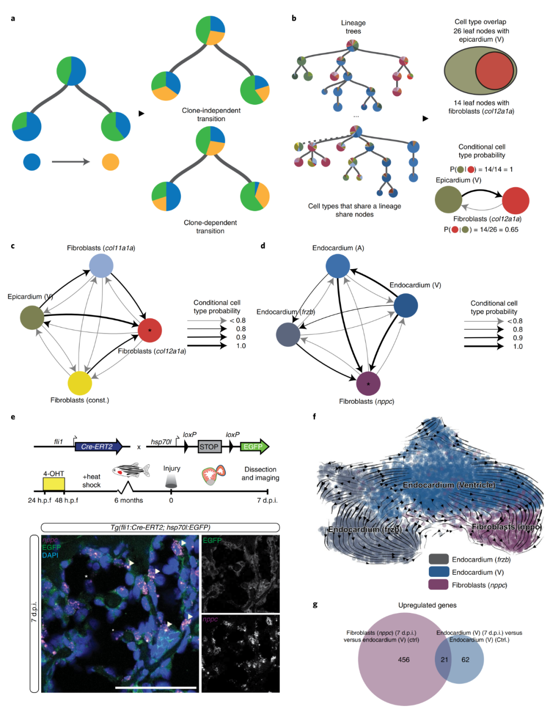 瞬時(shí)nppc成纖維細(xì)胞和其他幾個(gè)成纖維細(xì)胞亞型(spock3、cfd和瓣膜成纖維細(xì)胞)在3 d.p.i.或7 d.p.i.時(shí)不屬于心外膜譜系,但與心內(nèi)膜以及彼此之間顯示中度正相關(guān)?;谙嚓P(guān)性的分析有一個(gè)潛在的假設(shè),即所有克隆體都會(huì)表現(xiàn)出相似的轉(zhuǎn)換率(圖5a),但是這種假設(shè)并不適用于所有細(xì)胞類型,于是作者引入條件概率開發(fā)了第二種算法(圖5b)。在3 d.p.i.時(shí),不同成纖維細(xì)胞類型:col11a1a成纖維細(xì)胞、構(gòu)成型成纖維細(xì)胞、心外膜(心室)轉(zhuǎn)變?yōu)?em>col12a1a成纖維細(xì)胞類型的條件概率均大于0.9(圖5c)。在7 d.p.i. 時(shí),不同的心內(nèi)膜細(xì)胞類型:心內(nèi)膜(心房)、心內(nèi)膜(心室)和心內(nèi)膜 ( frzb )轉(zhuǎn)變?yōu)?em>nppc成纖維細(xì)胞的條件概率均大于0.8,表明這種成纖維細(xì)胞類型與心內(nèi)膜之間存在譜系關(guān)系。為了驗(yàn)證算法的真實(shí)性,作者構(gòu)建了轉(zhuǎn)基因系Tg(fli1:Cre-ERT2; hsp70l:Switch)。在7 d.p.i.表達(dá)的EGFP與內(nèi)源性表達(dá)的nppc共定位(圖5e),證實(shí)了瞬時(shí)nppc成纖維細(xì)胞的心內(nèi)膜起源。RNA速度分析揭示了心室內(nèi)膜和nppc成纖維細(xì)胞之間的轉(zhuǎn)錄相似性和潛在的過渡路徑(圖5f)。從單細(xì)胞轉(zhuǎn)錄組數(shù)據(jù)中觀察到,與健康對照組心臟相比,心內(nèi)膜在7 d.p.i.時(shí)發(fā)生了激活反應(yīng)(圖5g)。