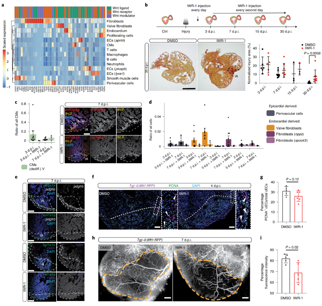 作者發(fā)現(xiàn)成纖維細(xì)胞中表達(dá)了許多與Wnt信號有關(guān)的基因(配體、受體和調(diào)節(jié)劑)(圖6a),于是這啟發(fā)了他們?nèi)パ芯縒nt信號在斑馬魚心臟再生過程中的作用。一方面,Wnt通常被認(rèn)為是一種促增殖因子,Wnt的激活已被證明對斑馬魚鰭和脊髓再生有益。另一方面,Wnt信號通路在心肌細(xì)胞去分化和增殖中的作用存在爭議。于是,作者在斑馬魚心臟冷凍損傷后,使用特征良好的Wnt/β-catenin依賴的信號抑制劑IWR-1抑制典型的Wnt信號,并在3,7,15和30 d.p.i.觀察其影響。結(jié)果發(fā)現(xiàn),Wnt/β-catenin信號通路抑制導(dǎo)致心臟再生顯著延遲,與對照組相比,心肌纖維化延長,損傷面積增大(圖6b)。IWR-1處理后心臟的單細(xì)胞轉(zhuǎn)錄組數(shù)據(jù)顯示心肌細(xì)胞去分化延遲,與對照組相比,去分化心肌細(xì)胞數(shù)量在3 d.p.i.時(shí)減少,而在7 d.p.i.時(shí)未定位于損傷區(qū)域(圖6c)。Wnt抑制后,血管周細(xì)胞和所有心內(nèi)膜成纖維細(xì)胞(nppc、spock3和瓣膜成纖維細(xì)胞)的水平顯著降低,而其他短暫增加的成纖維細(xì)胞總體上保持在類似水平(圖6d)。通過熒光原位雜交也證實(shí)了,Wnt信號對于心內(nèi)膜成纖維細(xì)胞的激活是必需的,類似于所描述的Wnt在誘導(dǎo)小鼠內(nèi)皮細(xì)胞向間充質(zhì)細(xì)胞轉(zhuǎn)化中的作用。