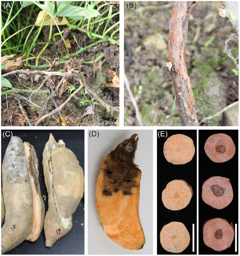 圖 1 大田感染 FRST 的甘薯植株表型。 (A)受感染的莖和葉。(B)覆蓋基部莖的帶紅色外皮。(C和D)受感染的貯藏根。(E)在致病性測(cè)試中接種 CRI 24-3 (右) 和陰性對(duì)照 (左) 的貯藏根。標(biāo)尺 = 5 厘米。