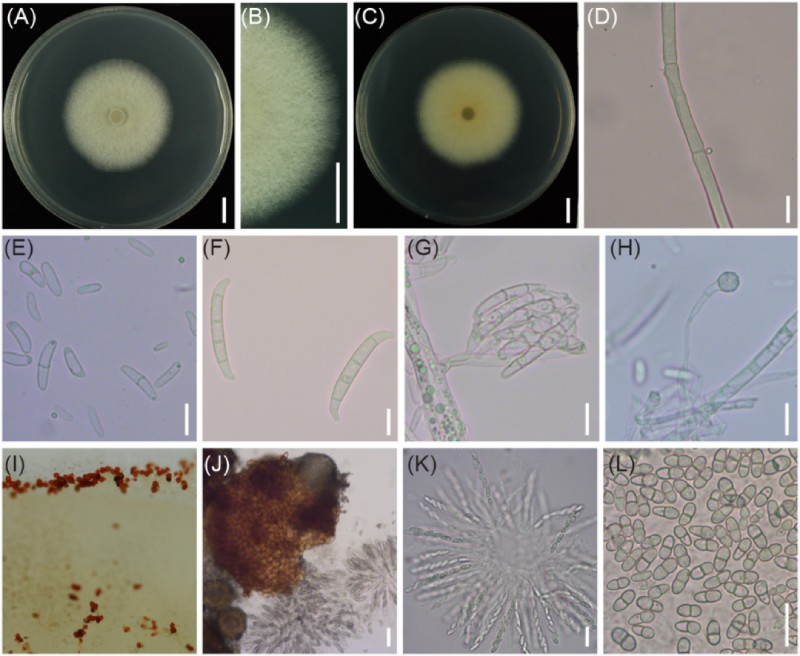 圖2 CRI 24-3在PSA上的形態(tài)特征。 (A 到 C) 培養(yǎng) 4 天后從表面和背面的菌落。標(biāo)尺 = 1 厘米。(D) 氣生菌絲。(E) 小分生孢子。(F) 大分生孢子。(G) 假頭中的分生孢子。(H) 衣藻。標(biāo)尺 = 10 微米。(I)Perithecia。(J) 放大的外皮層。標(biāo)尺 = 50 微米。(K) 子囊軸承 (L) 八個(gè)子囊孢子。標(biāo)尺 = 20 微米。