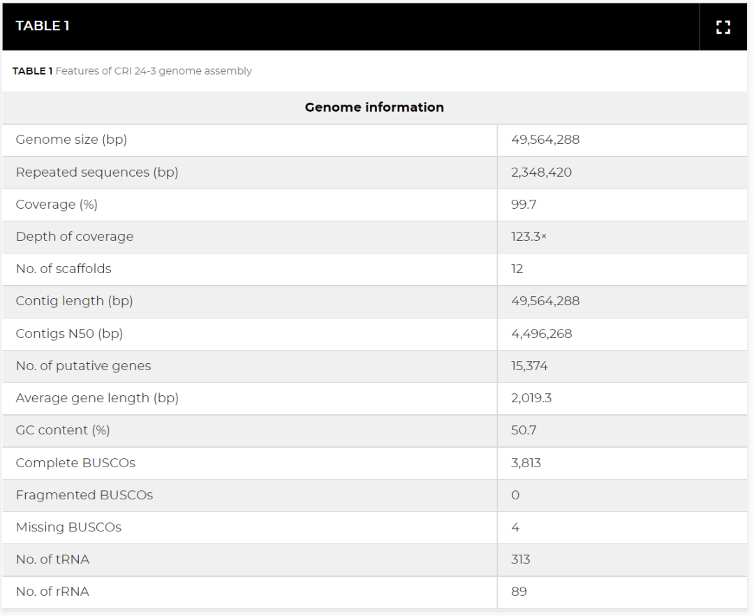 經(jīng)數(shù)據(jù)質(zhì)控后共獲得 452,011 條高質(zhì)量的clean reads(平均長(zhǎng)度 13,525.1 bp)(表 S1)。CRI 24-3的 49.6 Mb 基因組是由 12 個(gè)contigs產(chǎn)生的,該基因組具有 4.5 Mb 的contigs N50 和 50.7% 的 GC 含量,覆蓋深度估計(jì)為 123.3 倍(圖 3;表 1)?;蚪M質(zhì)量評(píng)估結(jié)果表明,CRI 24-3 的基因組組裝完整且準(zhǔn)確,因?yàn)?CRI 24-3 中的單拷貝直系同源基因與 sordariomycetes_odb10 數(shù)據(jù)集中所有 3,817 個(gè)完整核心基因的 99.9% 匹配(表 1)。