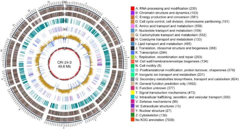 圖 3 CRI 24-3 基因組組裝圈圖。 (A) 12 個(gè)contigs的物理位置。標(biāo)尺?= 1 kb。(B 和 C)具有 KOG 類(lèi)的正向和反向鏈上的蛋白質(zhì)編碼基因。(D)?重復(fù)序列。(E)?正向鏈上的 tRNA(藍(lán)色)和 rRNA(紫色)編碼基因。(F)?某些區(qū)域的 GC 含量高于(黃色)或低于(藍(lán)色)平均基因組 GC 含量。(G) GC-skew = (G?C)/(G+C),具有正(黑色)或負(fù)(紅色)值。