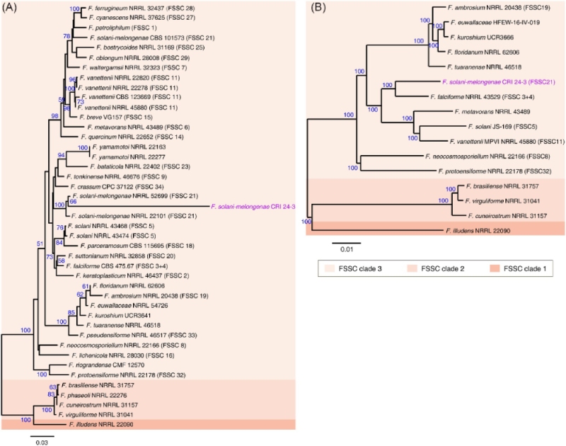 圖 4 CRI 24-3 和其他植物病原鐮刀菌的系統(tǒng)發(fā)育分析。 從?(A) ITS、RPB2 和 TEF 1-α 的串聯(lián)序列和 (B) 由 16 個(gè) FSSC 物種共享的 1,544 個(gè)單拷貝同源基因的組合序列推斷出的 ML 樹(shù)。?引導(dǎo)值(藍(lán)色)表示相關(guān)菌株聚集在一起的分支百分比。?括號(hào)中的阿拉伯?dāng)?shù)字區(qū)分了 FSSC 進(jìn)化枝 3 中系統(tǒng)發(fā)育不同的物種。