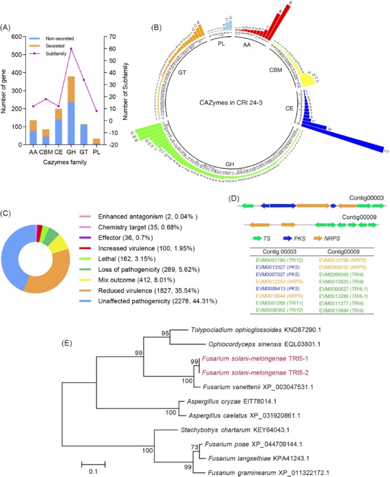 圖 5 CRI 24-3 蛋白質(zhì)組中的 CAZymes 和 PHI 蛋白。 (A) CAZymes 及其相關(guān)家族的數(shù)量。?(B) CAZymes 家族分布。?內(nèi)圈附近和條形頂部的數(shù)字分別代表家族 ID 和蛋白質(zhì)的數(shù)量。AA:輔助活性,CBM:碳水化合物結(jié)合模塊,CE:碳水化合物酯酶,GH:糖苷水解酶,GT:糖基轉(zhuǎn)移酶,PL:多糖裂解酶。?(C) 5141 PHI 蛋白的功能。?混合結(jié)果表明在一種蛋白質(zhì)中觀察到至少兩種不同的功能。?(D) 編碼 PKS、NRPS 和 TS 的串聯(lián)陣列基因聚集在 CRI 24-3 組裝的 Contig00003 和 Contig00009 中。?(E) 從 CRI 24-3 和其他相關(guān)物種的 11 條單孢菌素合酶序列推斷的系統(tǒng)發(fā)育關(guān)系分析。