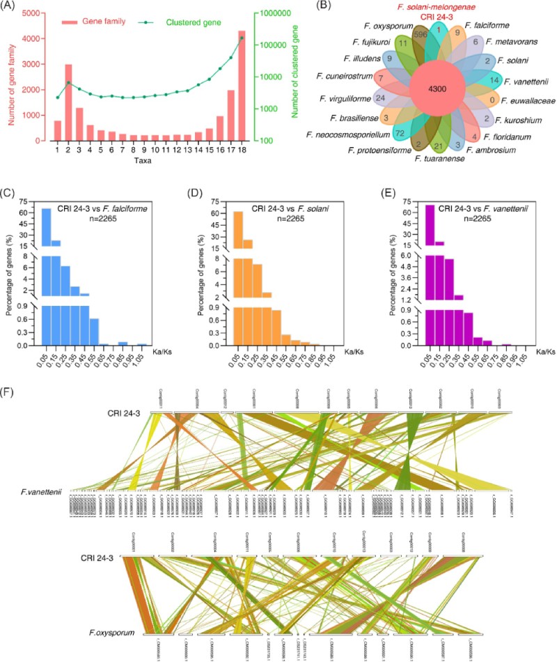 圖6 CRI 24-3與其他鐮刀菌的基因組比較分析。 (A)基因家族和聚集在相應(yīng)家族中的基因數(shù)量從1到18不等。(B)花形維恩圖。?中心值表示 18 個(gè)鐮刀菌屬中所有共有基因家族的數(shù)量;?花瓣的值表示每個(gè)物種中特有基因家族的數(shù)量。?(C 到 E)CRI 24-3 和?F. falciforme、F. solani、F. vanettenii?之間基因?qū)Φ?Ka/Ks 比率分布。?小寫(xiě)字母“n”后面的值表示所有檢測(cè)到的基因?qū)Φ臄?shù)量。?(F) 顯示基因組共線性的雙同線性圖。?不同顏色的線用于連接 CRI 24-3 和?F. vanettenii?(頂部) 或?F. oxysporum?(底部) 之間的直系同源基因?qū)Α?/p>
