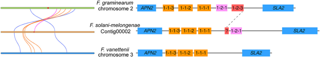 其他三種密切相關(guān)的 FSSC 物種F. falciforme、F. solani和F. vanettenii的基因組被用作參考基因組來(lái)探索 CRI 24-3 的選擇壓力。分別確定了 CRI 24-3 與?F. falciforme、F. solani?和F. vanettenii?之間的 2265、2272 和 2272 直系同源物對(duì)的非同義替換率 (Ka) 與同義替換率 (Ks) 的比率( 圖 6C 至 E)。Ka /Ks總體分析的值小于 1,表明 CRI 24-3 中的大多數(shù)直系同源物似乎都經(jīng)過(guò)了純化選擇并且高度保守。然而,CRI 24-3 和F. falciforme基因組的比較確定了一個(gè)快速進(jìn)化基因?qū)Γ‥VM0014458.1 與 GE10416_g)的 Ka /Ks比率大于 1,表明陽(yáng)性選擇可能發(fā)生在進(jìn)化。基因組共線性分析表明,F. vanettenii和F. oxysporum基因組中的幾個(gè)染色體片段在 CRI 24-3 中濃縮成一個(gè)片段,并有一些倒位(圖 6F )。此外,CRI 24-3 中的一些直系同源物具有多對(duì)一的關(guān)系。CRI 24-3 中至少有兩個(gè)查詢(xún)基因與參考物種中的相同直系同源物匹配。值得注意的是,CRI 24-3 的重要基因組區(qū)域不能與尖孢鐮刀菌基因組中的那些共線性耦合,由 35.9% 的共線性率(共線直系同源物對(duì)與所有直系同源物對(duì)的比率)支持,該比率低于CRI 24-3 和F. vanettenii?(77.6%)。結(jié)果表明,CRI 24-3在系統(tǒng)發(fā)育上與尖孢鐮刀菌相距較遠(yuǎn)。MAT基因座對(duì)于在鐮刀菌屬中產(chǎn)生子囊孢子至關(guān)重要。在此,交配型結(jié)構(gòu)組織 ( MAT ) 基因座在基于簡(jiǎn)化的共線性分析比較了茄科鐮孢菌CRI 24-3、禾谷鐮刀菌PH-1 和F. vanettenii?77-13-4(圖 7)。與僅攜帶 MAT1-1 基因的?F. vanettenii?77-13-4相比, CRI 24-3 含有MAT1-1和MAT1-2獨(dú)特型基因,在單個(gè)MAT基因座處與禾谷鐮刀菌密切相關(guān),除了 CRI 24-3 是 MAT1-2-3 缺陷型。只有位于 CRI 24-3 中 MAT1-2-1 上游區(qū)域的沒(méi)有任何特征功能域的片段與禾谷鐮刀菌中的 MAT1-2-3 具有序列相似性。