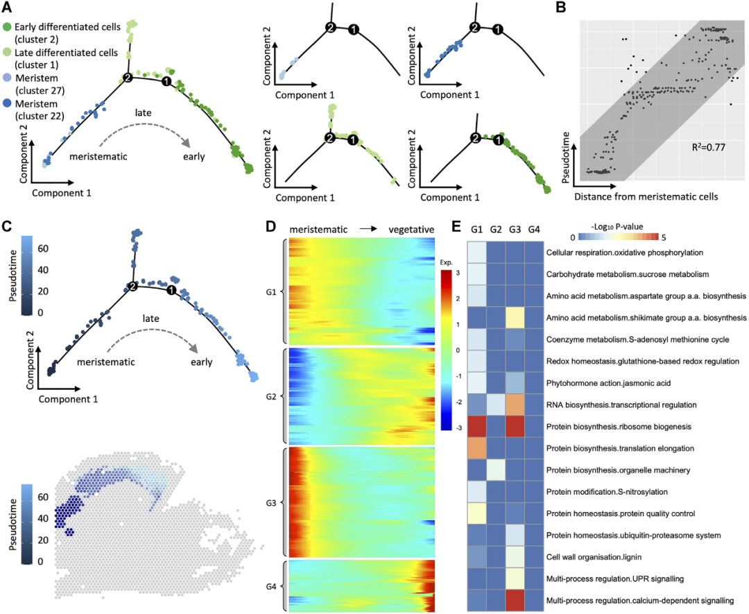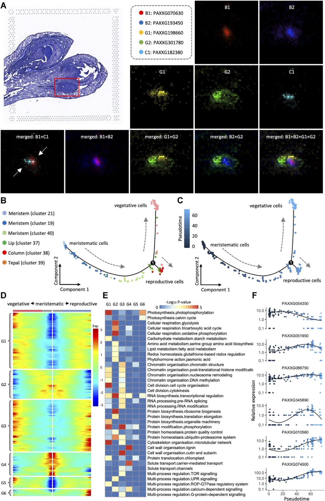 為了研究從分生組織細(xì)胞到營(yíng)養(yǎng)型細(xì)胞(花被、唇瓣)和生殖細(xì)胞(花柱)的分化,研究團(tuán)隊(duì)用Monocle繪制了細(xì)胞狀態(tài)的軌跡。如圖2B所示,三簇分生組織細(xì)胞形成了一條連續(xù)的路徑,代表其發(fā)育過程,與其在組織學(xué)切片上的位置高度一致。該路徑分為兩條子路徑:一條是由花被片中的營(yíng)養(yǎng)型細(xì)胞組成,另一條由花柱中的花藥原基生殖細(xì)胞組成。細(xì)胞類型變化的軌跡作為動(dòng)態(tài)發(fā)育過程的靜態(tài)投影,也可以理解為分生組織細(xì)胞的擬時(shí)序分化。如圖2C所示,此時(shí)營(yíng)養(yǎng)型細(xì)胞出現(xiàn)較早,并分散在子路徑的遠(yuǎn)端。共鑒定出4,685個(gè)空間差異基因與發(fā)育擬時(shí)間相關(guān),對(duì)這些基因繪制分支軌跡基因表達(dá)熱圖,發(fā)現(xiàn)它們隨著發(fā)育路徑的分離表現(xiàn)出不同的表達(dá)模式(圖2D)。MapMan功能富集圖顯示它們主要富集在細(xì)胞壁代謝、激素、脂質(zhì)、蛋白質(zhì)和RNA合成等功能上(圖2E)。通過基因的擬時(shí)分布圖發(fā)現(xiàn)許多其他基因可能在分生組織、營(yíng)養(yǎng)組織和生殖組織的細(xì)胞分化過程中發(fā)揮作用(圖2F)。