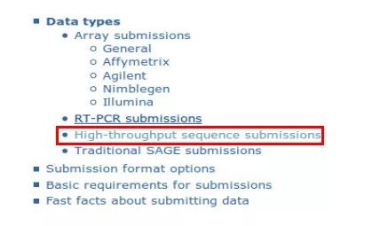 GEO數(shù)據(jù)庫支持上傳芯片數(shù)據(jù)、高通量數(shù)據(jù)以及RT-PCR數(shù)據(jù)等,首先選擇需要上傳數(shù)據(jù)的類型,接下來以high-throughput sequence submisssions (高通量測序)為例進行詳解。