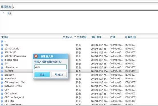 連接成功后,在遠程站點下的文件名展示中創(chuàng)建自己的文件,在fasp目錄下面創(chuàng)建自己的目錄(當(dāng)然也可以與fasp目錄同級下創(chuàng)建),例如ABC,創(chuàng)建方法為點擊鼠標右鍵,會出現(xiàn)下圖中的創(chuàng)建空文件夾對話框,輸入自己文件夾的命名,之后點擊確認,這樣你的文件夾就創(chuàng)建成功了。