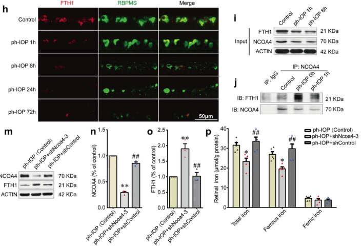 鐵蛋白(Ferritin)是一種廣泛存在的儲鐵蛋白,在 ph-IOP 損傷后1小時,F(xiàn)TH1(Ferritin亞基)的水平急劇下降(圖2h),這與 ph-IOP 損傷后早期的鐵積累一致;鐵自噬(ferritinophagy)是一種調(diào)節(jié)細(xì)胞內(nèi)鐵代謝的選擇性自噬,檢測視網(wǎng)膜內(nèi)源性NCOA4(鐵自噬關(guān)鍵調(diào)節(jié)蛋白)蛋白水平發(fā)現(xiàn),pH-IOP 損傷后NCOA4與 FTH1之間的內(nèi)源性相互作用增強(qiáng)(圖2i, j);敲降Ncoa4后增加了視網(wǎng)膜 FTH1水平(圖2m-o),并伴隨著 ph-IOP 損傷后視網(wǎng)膜中二價鐵離子水平的降低(圖2p)。