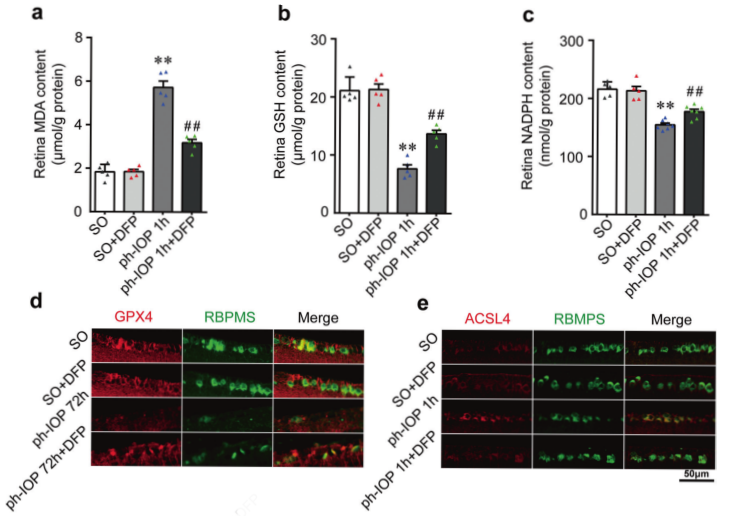 去鐵酮DPF作為鐵螯合劑目前已應(yīng)用于臨床治療鐵超負(fù)荷疾病,阻止患者血清鐵的蓄積。進(jìn)一步研究DFP對ph-IOP損傷小鼠鐵代謝的影響。體內(nèi)體外結(jié)果顯示,DFP處理可以顯著降低 ph-IOP誘導(dǎo)的視網(wǎng)膜二價鐵累積;DFP治療可降低ph-IOP損傷后視網(wǎng)膜MDA含量(圖4a),增加GSH和NADPH水平(圖5b, c );此外,在ph-IOP損傷小鼠中,DFP處理恢復(fù)了GPX4水平,并降低了ACSL4水平(圖5d-e)。以上結(jié)果表明,DFP可以改善ph-IOP誘導(dǎo)的視網(wǎng)膜鐵死亡。