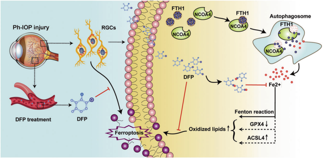在生理狀態(tài)下,細(xì)胞內(nèi)鐵處于動態(tài)平衡狀態(tài),但在病理狀態(tài)下,這種平衡會被打破。Ph-IOP 損傷可以激活RGC細(xì)胞內(nèi)的NCOA4,激活的NCOA4將結(jié)合FTH1并觸發(fā)溶酶體降解FTH1(稱為鐵自噬)。降解的FTH1會釋放大量的游離鐵離子,這種具有氧化還原活性的金屬會進(jìn)一步參與脂質(zhì)過氧化。最終,由鐵引起的脂質(zhì)過氧化氫的積累導(dǎo)致RGC鐵死亡,但口服DFP可以螯合細(xì)胞內(nèi)多余的游離鐵離子,抑制ph-IOP誘導(dǎo)的RGC鐵死亡。