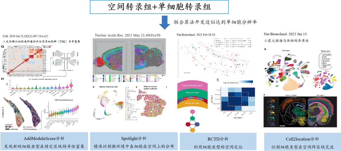 基因表達(dá)具有時間和空間特異性,單細(xì)胞轉(zhuǎn)錄組主要從時間上研究基因表達(dá),能夠系統(tǒng)的識別組織中的細(xì)胞亞群,但沒有捕獲其空間組織信息,限制了我們對組織及細(xì)胞間相互作用的理解。而空間轉(zhuǎn)錄組的應(yīng)用使得人們能夠從空間的角度解析數(shù)據(jù),在空間上研究基因的表達(dá)。通過整合兩種數(shù)據(jù)模式,將單細(xì)胞轉(zhuǎn)錄組數(shù)據(jù)和空間轉(zhuǎn)錄組數(shù)據(jù)進(jìn)行聯(lián)合分析,在時空上分析基因的表達(dá)具有重要的意義。