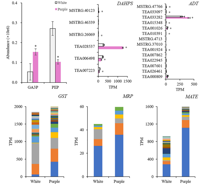 選擇與AP和DpG高度相關(guān)的轉(zhuǎn)錄因子(TFs),研究它們與差異表達的結(jié)構(gòu)基因的相關(guān)性。結(jié)果顯示MYB、AP2/ERF、bZIP、TCP、GATA等基因顯著表達,并專注于Phe上游合成基因的調(diào)控(DAHPS;和AP(苯乙醛還原酶、短鏈脫氫酶/還原酶)、Dp(F3’H;F3’?5’?H)和DpG(BZ1)的合成,但抑制黃酮(黃酮醇合酶)和兒茶素(白花青素還原酶)的形成。這些結(jié)果發(fā)現(xiàn)了紫茶樹中揮發(fā)性BPs的促進作用,擴展了我們對BPs型顏色與香氣關(guān)系的理解。