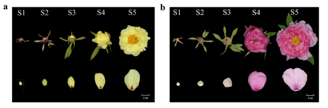 為表征樹牡丹花色發(fā)育情況,以黃花品種“海黃”和紫紅花品種“肉芙蓉”為研究對象,在花蕾早期至盛開的S1-S5共5個發(fā)育階段對兩個品種的花瓣組織進行了取樣,用于測定花瓣顏色指數(shù),在“海黃”中發(fā)現(xiàn)L *(明度)值從S1到S5逐漸增加,這表示花瓣顏色明度升高。C *(色度)和b *(黃色)在S3達到峰值,隨后在S4和S5下降,證明S3是顏色最黃的階段。而“肉芙蓉”在整個開花過程中沒有觀察到L *的顯著變化。在S1到S5階段,“肉芙蓉”中b *顯著低于“海黃”。同樣,“肉芙蓉”中a *(紅色)比“海黃”要高得多。