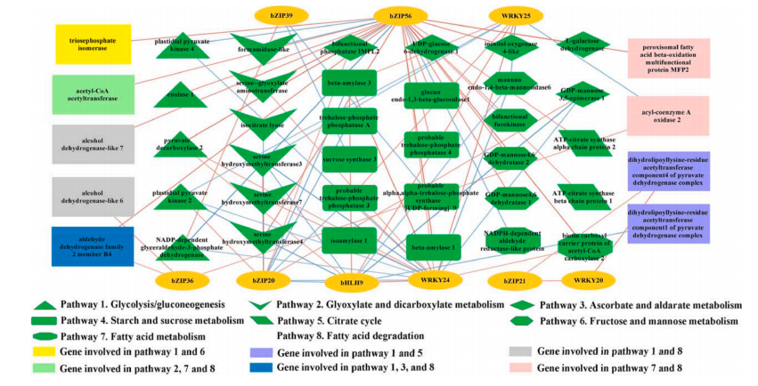 該研究對中國7個地區(qū)突尼斯石榴的代謝組和轉(zhuǎn)錄組、風(fēng)味相關(guān)屬性和揮發(fā)性化合物進行了研究。7個不同種植區(qū)的石榴,糖、有機酸和維生素c含量存在顯著差異。所有樣品共鑒定了40種揮發(fā)性化合物,其中13種揮發(fā)性化合物。所有樣品中有4種化合物含量較高,包括1-己醇、(Z)-3-己烯醇、α-松果醇和2,4-二叔丁基苯酚,是影響石榴香氣品質(zhì)的主要貢獻因素。所有樣品的5個差異積累代謝物,包括棕櫚酸、辛酸、月桂酸、癸酸和肉豆蔻酸,在所有樣品的脂肪酸生物合成中均顯著富集。WGCNA分析結(jié)果表明42個候選風(fēng)味相關(guān)差異表達基因和9個轉(zhuǎn)錄因子主要位于3個關(guān)鍵模塊中。己烷酸是一種重要的代謝物,與38個差異表達基因顯著相關(guān)。本研究構(gòu)建了復(fù)雜的調(diào)控網(wǎng)絡(luò),以確定調(diào)控石榴中揮發(fā)性化合物代謝的結(jié)構(gòu)基因和轉(zhuǎn)錄因子,發(fā)現(xiàn)bZIP56、bZIP56、bZIP20、WRKY24和bHLH9在石榴果皮的風(fēng)味代謝調(diào)控中起重要作用。