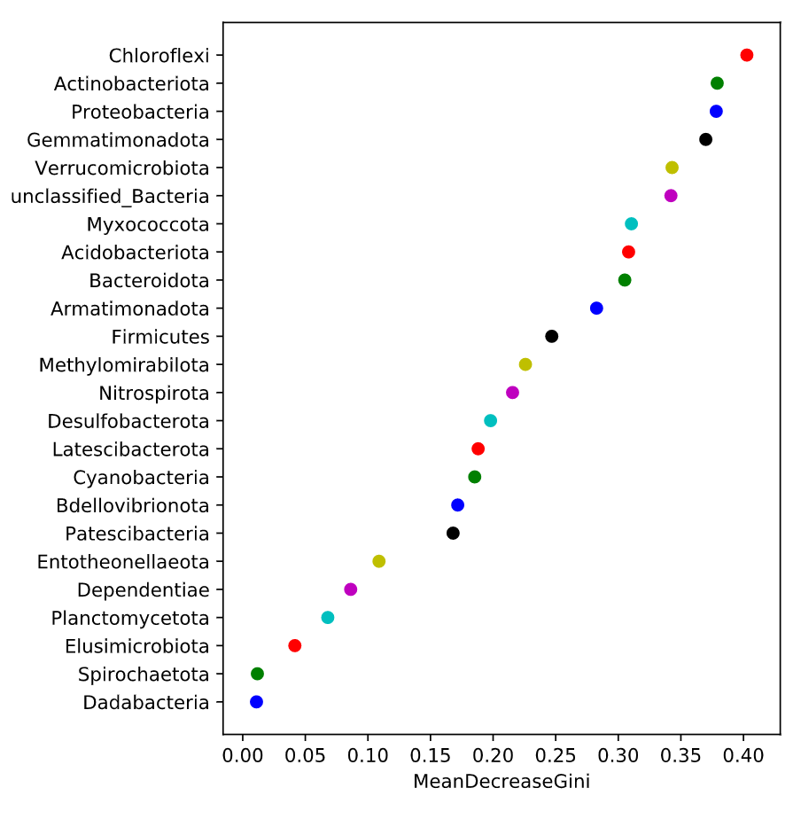 隨機森林分析:Random forest 分析,隨機森林指的是利用多棵樹對樣本進(jìn)行訓(xùn)練并預(yù)測的一種分類器,是機器學(xué)習(xí)的一種。利用隨機森林分析可以幫我們找到數(shù)據(jù)中重要的特征:在微生物組中就是哪些微生物組成可以作為特征進(jìn)行各種預(yù)測;另外,隨機森林可以利用這些重要特征構(gòu)建模型用于分類預(yù)測(分類變量)或者回歸預(yù)測(數(shù)值型變量);隨機森林分析建議分組內(nèi)樣品至少30個以上,樣品數(shù)太少影響準(zhǔn)確性。 隨機森林分析,一般將數(shù)據(jù)劃分為訓(xùn)練數(shù)據(jù)集(train data)和測試數(shù)據(jù)集(test or validate data),訓(xùn)練數(shù)據(jù)集用于構(gòu)建預(yù)測模型,測試集用于查看模型的準(zhǔn)確性。