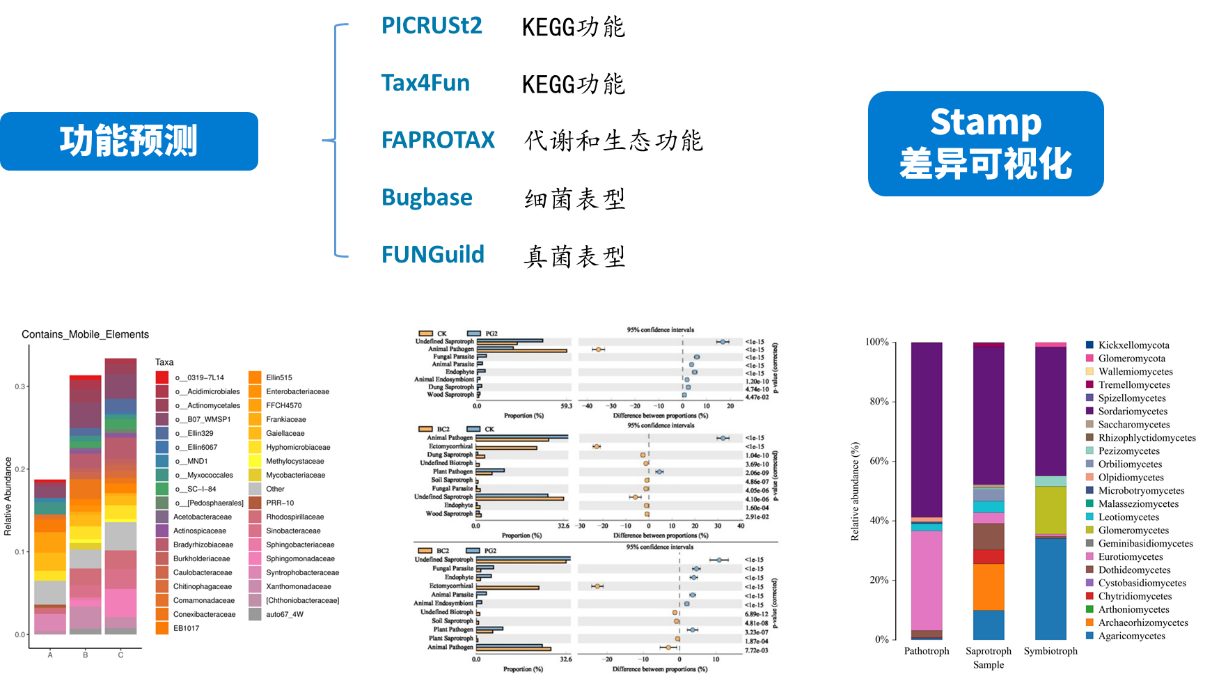 PICRUSt 2 將特征序列(16S rRNA)與微生物基因組數(shù)據(jù)庫(IMG,Integrated Microbial Genomes)參考序列對齊(aliign)構(gòu)建進(jìn)化樹,找到特征序列的“最近物種”,并根據(jù)已知物種的基因種類和豐度信息預(yù)測未知物種的基因信息,從而結(jié)合基因的KEGG通路信息預(yù)測整個群落的通路情況。通過組間差異分析,得到在組間具有顯著差異的功能,最后利用Stamp對結(jié)果進(jìn)行差異可視化。