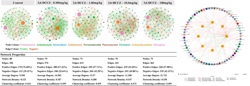 相關(guān)性網(wǎng)絡(luò)分析:網(wǎng)絡(luò)圖是相關(guān)性分析的一種表現(xiàn)形式,根據(jù)各個物種在各個樣品中的豐度以及變化情況,進(jìn)行斯皮爾曼(Spearman )秩相關(guān)分析并篩選相應(yīng)條件下的數(shù)據(jù)構(gòu)建相關(guān)性網(wǎng)絡(luò)?;诰W(wǎng)絡(luò)圖的分析,可以獲得物種在環(huán)境樣本中的共存關(guān)系,得到物種在同一環(huán)境下的相互作用的情況及重要的模式信息,進(jìn)一步解釋樣本間表型差異的形成機制。