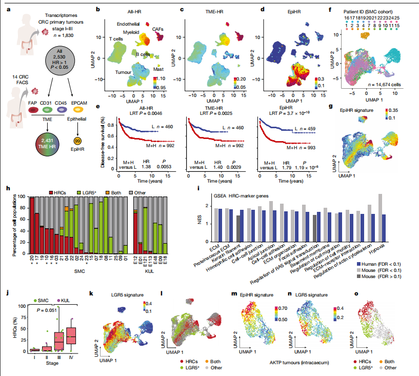 該團(tuán)隊(duì)通過單細(xì)胞轉(zhuǎn)錄組測(cè)序(scRNA-seq)手段,首先對(duì)CRC患者樣本進(jìn)行數(shù)據(jù)分析,發(fā)現(xiàn)大多數(shù)不良預(yù)后基因是由一群獨(dú)特的腫瘤細(xì)胞(包括:CAFs、內(nèi)皮細(xì)胞以及較小程度上髓系細(xì)胞)表達(dá)的,該團(tuán)隊(duì)將其命名為高復(fù)發(fā)細(xì)胞(high-relapsecells,HRCs)。