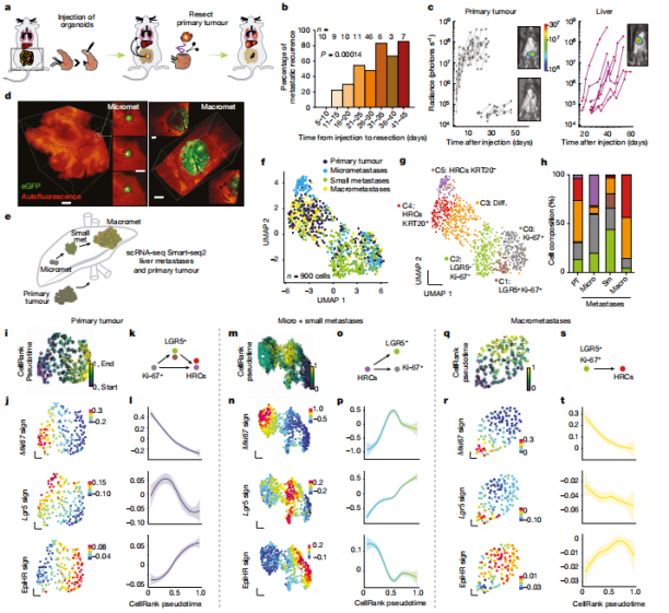 接著研究團(tuán)隊(duì)建立了CRC小鼠模型,模擬手術(shù)切除原發(fā)腫瘤后發(fā)生轉(zhuǎn)移性復(fù)發(fā)的過程。發(fā)現(xiàn)原發(fā)性CRC手術(shù)后,小鼠肝臟中殘留的HRCs的增殖活動(dòng)很少,對(duì)原發(fā)性結(jié)腸癌的生長(zhǎng)沒有貢獻(xiàn)。但隨著時(shí)間的推移,殘留的HRCs會(huì)產(chǎn)生多種細(xì)胞類型,包括LGR5干細(xì)胞樣腫瘤細(xì)胞。這群HRC細(xì)胞能夠脫離原發(fā)性結(jié)腸癌,遷移到血液中,到達(dá)肝臟,并在手術(shù)后隱藏一段時(shí)間,隨后引發(fā)明顯的腫瘤轉(zhuǎn)移。