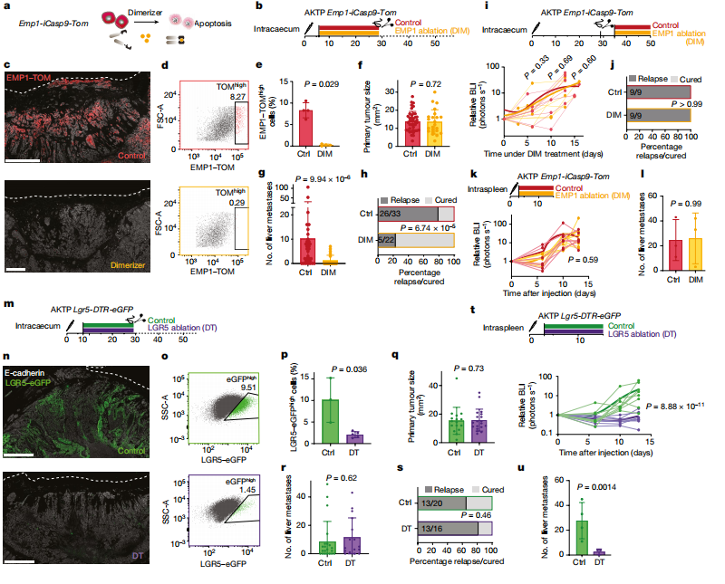 為了找到結(jié)直腸癌的轉(zhuǎn)移性復(fù)發(fā)的真正來源,研究人員借助人和小鼠模型,借助單細(xì)胞轉(zhuǎn)錄組測(cè)序技術(shù)(scRNA-seq),發(fā)現(xiàn)EMP1在 HRCs細(xì)胞中高表達(dá),且與EpiHR基因的表達(dá)有很大的重疊。進(jìn)一步通過細(xì)胞消融實(shí)驗(yàn),證明了導(dǎo)致腫瘤復(fù)發(fā)來源于殘留的EMP1陽性細(xì)胞。