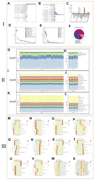 圖5.宏基因組測(cè)序結(jié)果。 (Ⅰ:功能注釋分析。Ⅱ:KEGG通路組成和豐度直方圖。Ⅲ:metagenomeSeq差異通路豐度熱圖)。