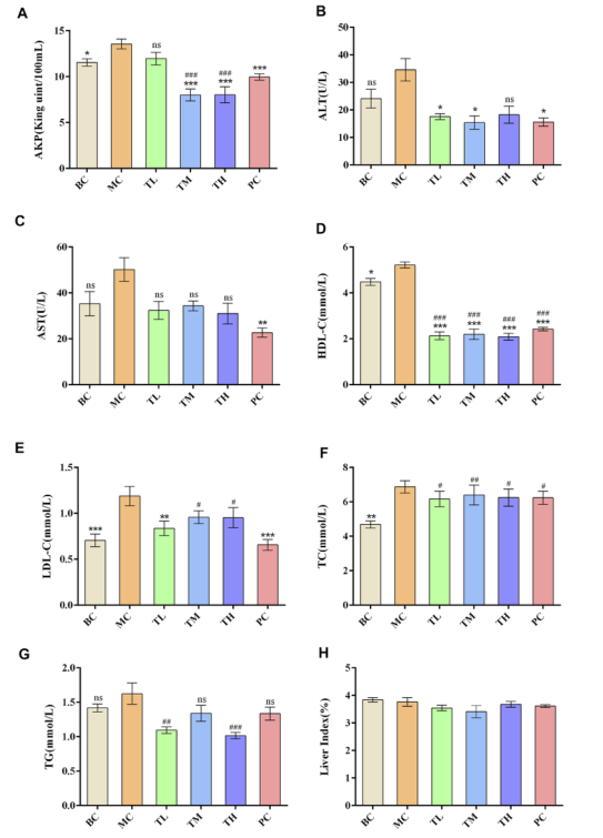 TM組和TH組降低AKP效果優(yōu)于TL組,TG組降低AKP效果優(yōu)于TM組。PC組降低AKP的效果優(yōu)于TL組,但差于TM組和TH組。PC組降低低密度脂蛋白膽固醇的效果優(yōu)于TM組和TH組,表明高脂飼料可導(dǎo)致大鼠血脂和肝酶代謝異常,高脂高脂顆??筛纳聘咧笫笱x和肝酶活性。與陽性藥物相比,HRG在改善高密度脂蛋白膽固醇、甘油三酯、堿性磷酸酶方面具有優(yōu)勢(shì),且改善程度可能呈劑量依賴性。各組間器官指數(shù)無顯著差異,HRG對(duì)小鼠生化指標(biāo)和器官指數(shù)的影響如圖2所示。