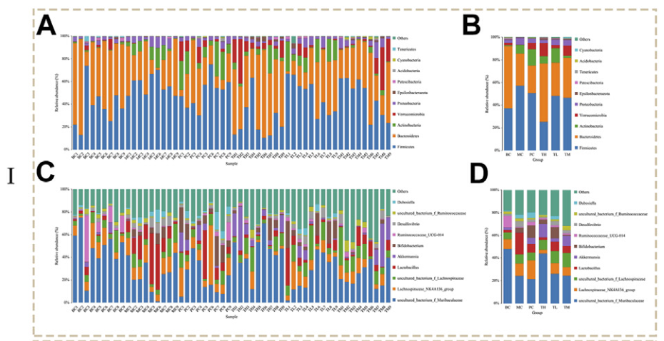 對(duì)糞便樣本進(jìn)行16s rRNA基因測(cè)序分析,在門、綱、目、科和屬的水平上對(duì)微生物群進(jìn)行了鑒定和分析,最終共鑒定到17門、26綱、56目、86科、187屬。主要物種為厚壁菌門和擬桿菌門,其次是放線菌門、疣微菌門和變形菌門。此外,物種主要分布在uncultured_bacterium_f_Muribaculacea屬和lachnospiraceae NK4A136 group,其次是uncultured_bacterium_f_Lachnospirae、Lactobacillus和Akkermansia。