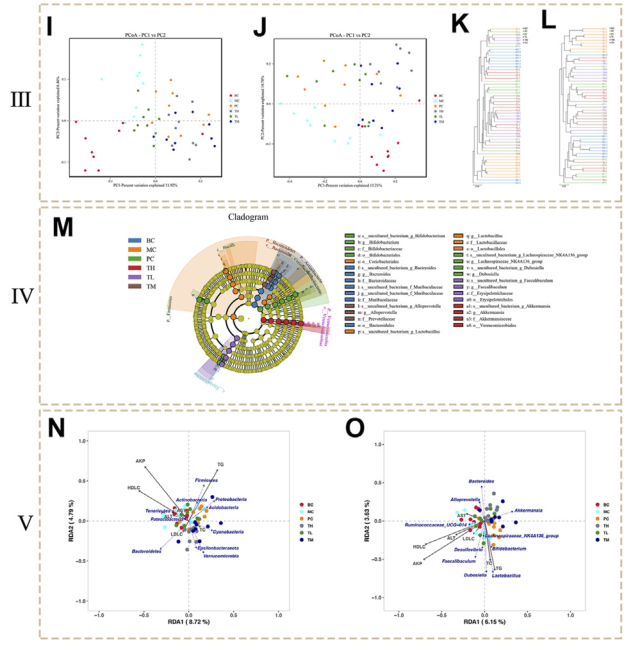 圖3 beta多樣性分析,LEfSe分析和RDA分析