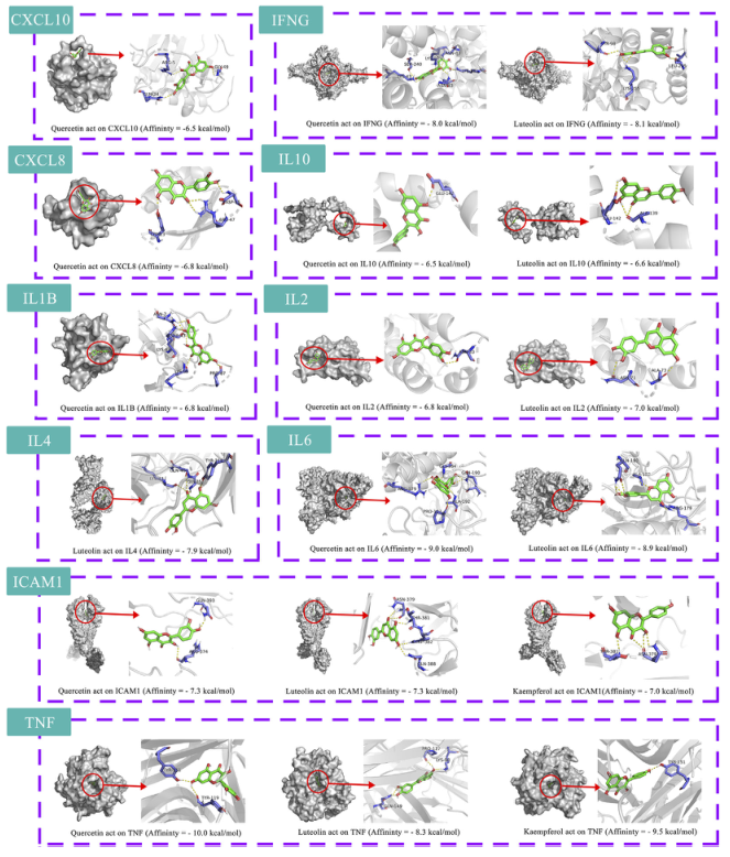 利用10個(gè)關(guān)鍵治療靶點(diǎn)、14個(gè)關(guān)鍵化合物和相關(guān)通路,通過Cytoscape構(gòu)建了“藥草-關(guān)鍵化合物-潛在靶點(diǎn)-通路”的網(wǎng)絡(luò)圖(圖4H)。排名前三的化合物被選為潛在化合物(槲皮素、木犀草素、山柰酚)。選擇前三個(gè)信號(hào)通路作為關(guān)鍵通路。繪制了 HRG 通過腸道菌群治療 NAFL 的通路機(jī)制(圖 4I)。將10個(gè)關(guān)鍵靶點(diǎn)與3個(gè)潛在化合物進(jìn)行分子對(duì)接,共獲得18對(duì)對(duì)接結(jié)果(表4),使用 Pymol 可視化結(jié)果(圖 5)。