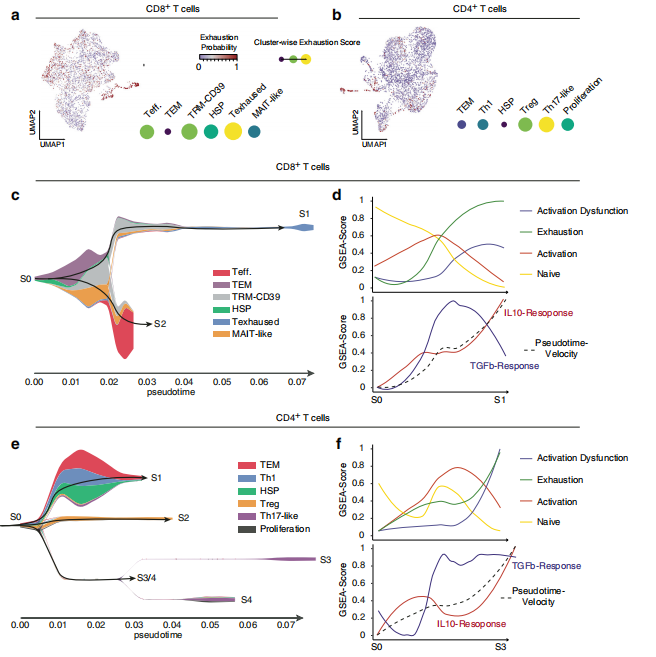 該團(tuán)隊(duì)對?8?名診斷為新發(fā)膠質(zhì)母細(xì)胞瘤的患者腫瘤組織樣本進(jìn)行了單細(xì)胞測序和數(shù)據(jù)分析,發(fā)現(xiàn)“S1”狀態(tài)與?T?細(xì)胞耗竭/功能障礙標(biāo)志物(HAVCR2、CTLA4?和?PDCD1)的表達(dá)增加,為了確定與?T?細(xì)胞耗竭相關(guān)的轉(zhuǎn)錄途徑,進(jìn)行了通路信號傳導(dǎo)推斷,揭?示了?T?細(xì)胞耗竭與?IL-10?以及部分?TGF??反應(yīng)之間存在著相關(guān)性。