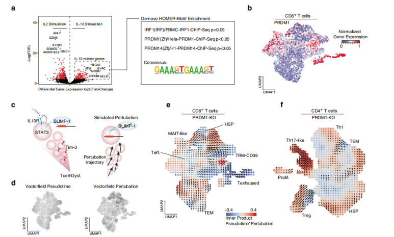 該團(tuán)隊(duì)通過擾動(dòng)模擬,用IL-10刺激所產(chǎn)生scRNA-seq數(shù)據(jù)集富集分析推斷常見轉(zhuǎn)錄因子結(jié)合位點(diǎn),發(fā)現(xiàn)ChiP-seq數(shù)據(jù)中基因BLIMP-1和IRF1峰之間密切重疊,IRF1和PRDM1/14結(jié)合位點(diǎn)的顯著富集,提出了“IL10-STAT3-BLIMP-1信號軸可能是腫瘤相關(guān)T細(xì)胞耗竭的潛在驅(qū)動(dòng)因素”的假設(shè)。為了進(jìn)一步驗(yàn)證猜想,作者對PRDM1進(jìn)行了計(jì)算機(jī)擾動(dòng)模擬驗(yàn)證,發(fā)現(xiàn)膠質(zhì)瘤母細(xì)胞瘤微環(huán)境中髓樣細(xì)胞分泌IL-10驅(qū)動(dòng)誘發(fā)T?細(xì)胞耗竭。