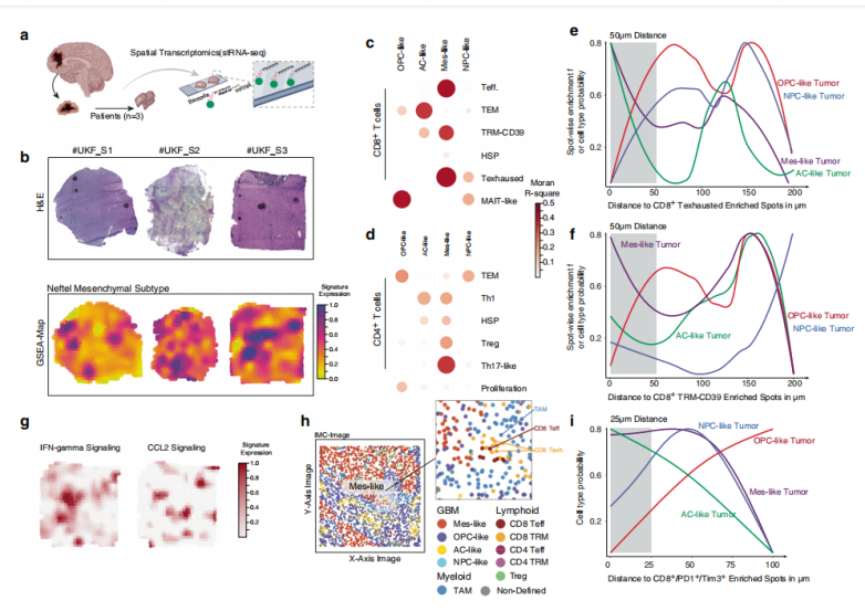 為了確定?T?細(xì)胞簇的空間位置信息,以及與特定腫瘤狀態(tài)共定位信息,作者進(jìn)行了空間分辨轉(zhuǎn)錄組RNA測序(stRNAseq)。該團(tuán)隊(duì)收集3名原發(fā)性GBM IDH1/2 Wt患者組織樣本,數(shù)據(jù)集總共包含2352個(gè)測序點(diǎn),每個(gè)點(diǎn)的中位數(shù)為8個(gè)細(xì)胞(范圍:每個(gè)spot點(diǎn)捕獲4~22個(gè)細(xì)胞)。作者通過NMF回歸和Moran統(tǒng)計(jì)分析,發(fā)現(xiàn)CD8+T細(xì)胞簇與GBM亞型相關(guān)聯(lián),腫瘤區(qū)域富集為間充質(zhì)樣腫瘤(MES樣),星形膠質(zhì)細(xì)胞樣(AC樣)轉(zhuǎn)錄特征與活化的CD8+效應(yīng)子、CD8+T耗盡簇共定位。