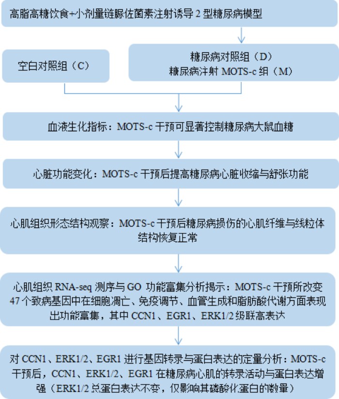 心臟重構(gòu)和功能障礙是糖尿病常見的并發(fā)癥,常導(dǎo)致嚴(yán)重的心血管事件。MOTS-c是一種線粒體衍生肽,通過加速葡萄糖攝取和提高胰島素敏感性來調(diào)節(jié)代謝穩(wěn)態(tài)。目前發(fā)現(xiàn),MOTS-c不僅可改善心臟與血管內(nèi)皮功能,且其含量在糖尿病患者血漿中明顯下降,使其成為糖尿病心血管并發(fā)癥的一個新的治療靶點(diǎn)。所以,該研究旨在探究MOTS-c對糖尿病心臟結(jié)構(gòu)與功能的影響并利用轉(zhuǎn)錄組學(xué)技術(shù)挖掘其中的分子機(jī)制。