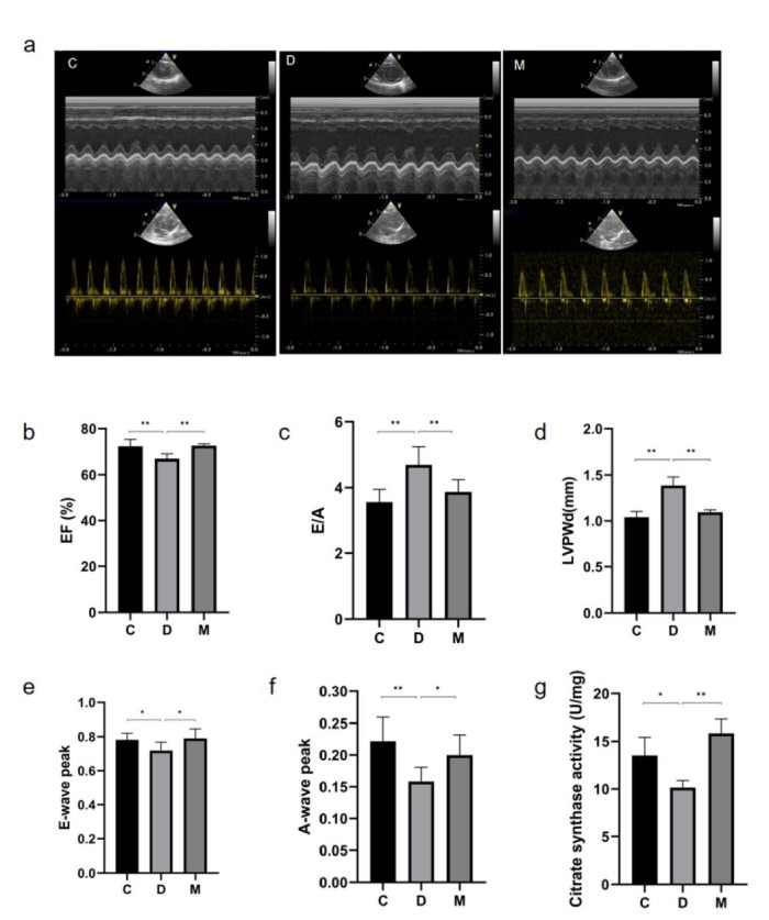 該研究利用透射電鏡測定了MOTS-c對糖尿病心肌超微結(jié)構(gòu)的影響。糖尿病引起心肌纖維排列紊亂和線粒體結(jié)構(gòu)的異常改變,包括心肌細(xì)胞排列不規(guī)則、嵴破裂、腫脹和空泡化(圖2)。MOTS-c治療糖尿病大鼠顯著降低心肌線粒體損傷,改善心肌纖維和線粒體結(jié)構(gòu)(圖2)。研究還通過測定檸檬酸合酶的活性,測定了線粒體功能。D組大鼠檸檬酸合酶的活性顯著降低,C組和M組的檸檬酸合酶的活性無統(tǒng)計學(xué)差異(圖3g)。