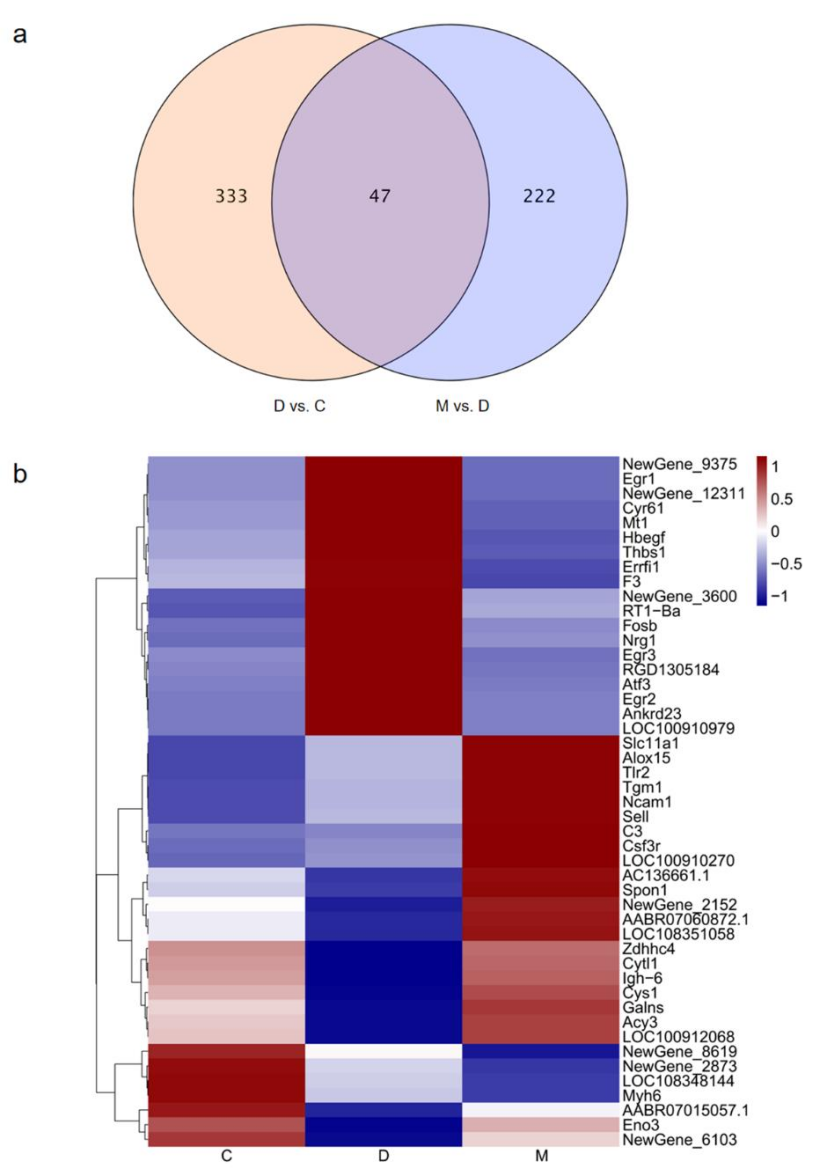 為了進(jìn)一步探究糖尿病大鼠對MOTS-c的適應(yīng)性反應(yīng)的機(jī)制,研究者利用RNA-Seq技術(shù),測定了心肌組織基因全長轉(zhuǎn)錄表達(dá)。以C組為對照,D組表現(xiàn)出的差異表達(dá)基因(DEGs)即致病基因,再以D組為對照組篩選出M組的差異表達(dá)基因,二者篩選出的DEGs中重疊的基因即為MOTS-c改變的致病基因。將以上步驟執(zhí)行,篩選出47個MOTS-c改變的致病基因(圖4a)。將這47個基因進(jìn)行熱圖分析后發(fā)現(xiàn),C組基因表達(dá)趨勢與D組相反,而與M組近似(圖4b)。
