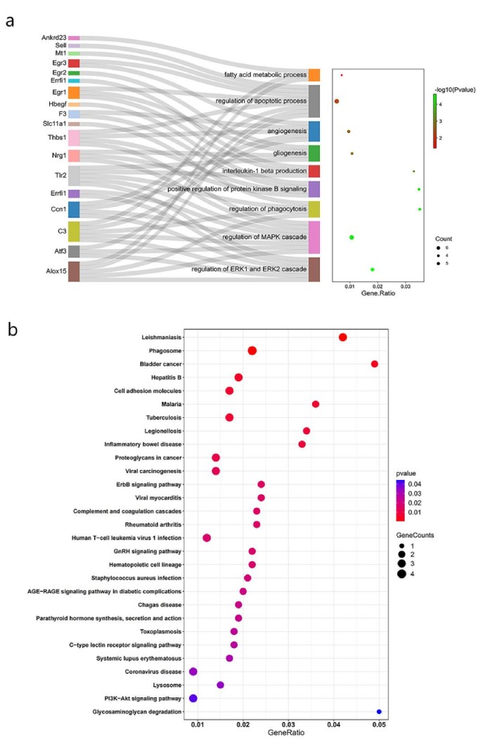 采用Gene Ontology(GO)與Kyoto Encyclopedia of Genes and Genomes(KEGG)對MOTS-c所改變的47個致病基因進(jìn)行功能富集分析。GO 注釋系統(tǒng)包含三個主要分支,即:生物學(xué)過程(BP)、分子功能(MF)和細(xì)胞組分(CC)。)8 周 MOTS-c 注射所改變的 47 個糖尿病致病基因共富集于 195 個 GO term 中,其中 188 個 term 富集于 BP,2 個 term 富集于 CC,5 個 term 富集于MF。經(jīng)過 ClueGO 聚類分析后,195 個 term 主要富集于 9 個類別(見圖 5b),分別為血管生成(angiogenesis)、凋亡過程調(diào)控(regulation of the apoptotic process)、MAPK 級聯(lián)調(diào)控(regulation of MAPK cascade)、蛋白激酶活性正調(diào)控(positive regulation of protein kinase activity)、脂肪酸代謝過程(fatty acid metabolic process)、吞噬作用調(diào)節(jié)(regulation of phagocytosis)、蛋白激酶 B 信號正調(diào)控(positive regulation of protein kinase B signaling)、ERK1/2 級聯(lián)(regulation of ERK1/2 cascade)、膠質(zhì)生成(gliogenesis)和白細(xì)胞介素-1 的產(chǎn)生(interleukin-1 beta production)。KEGG通路富集分析顯示,18條KEGG通路顯著富集(圖5b),其中5條信號通路與免疫、凋亡和糖代謝相關(guān)(ErbB信號通路、補(bǔ)體和凝血級聯(lián)、c型凝集素受體信號通路、PI3K-Akt信號通路和AGE-RAGE信號通路)。在功能富集通路注釋基因中,ALOX15、ATF3、CCN1、EGR1、EGR3、ERRFI1、THBS1、TLR2和NRG1高頻率注釋。CCN1與EGR1基因高表達(dá),同時均注釋在凋亡相關(guān)的GO term中,而CCN1也注釋于富集顯著性最高的ERK1/2級聯(lián)通路中,表明CCN1、ERK1/2與EGR1可能是相互關(guān)聯(lián)的關(guān)鍵基因。