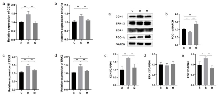 為了驗(yàn)證CCN1、ERK1/2與EGR1是否在MOTS-c改善糖尿病心臟結(jié)構(gòu)與功能中發(fā)揮重要作用,也為了進(jìn)一步探究MOTS-c對線粒體發(fā)生的作用,研究者利用RT-PCR與Western Blotting技術(shù)測定了CCN1、ERK1/2、EGR1的基因表達(dá)與蛋白表達(dá)以及線粒體發(fā)生標(biāo)志蛋白PGC-1α的蛋白表達(dá)。結(jié)果表明,MOTS-c治療后,糖尿病大鼠心肌中PGC-1α蛋白表達(dá)顯著上升(圖7a);CCN1、ERK1/2和EGR1基因表達(dá)顯著降低(圖6);CCN1、EGR1蛋白表達(dá)顯著降低,ERK1/2的總蛋白表達(dá)量不變(圖7),但多個研究表明MOTS-c僅影響ERK1/2的磷酸化水平。