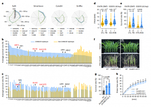 此前研究中,基于全基因組關聯分析(GWAS)和孟德爾隨機化分析分別鑒定了42個和97個抗旱性候選基因。作者在CIMBL55基因組中對這些位點的基因型進行研究,鑒定得到108個抗旱基因。值得注意的是,在CIMBL55中發(fā)現了65個基因的優(yōu)異單倍型,解釋了CIMBL55優(yōu)良抗旱性的遺傳基礎。此外,在108個基因中,有11個候選基因在非CIMBL55等位基因中被鑒定為優(yōu)勢單倍型,這表明其他種質可能含有與CIMBL55互補的玉米抗旱性遺傳資源(圖3b)。