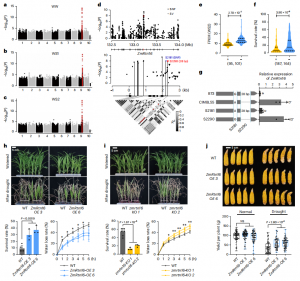 研究發(fā)現,位于ZmABF4基因第二內含子的SNP (S1474)和SV (S3205, 42 bp)與該基因的表達和苗期抗旱性密切相關。ZmABF4編碼bZIP轉錄因子,為ABA和干旱誘導表達的主要調節(jié)因子。攜帶ZmABF4CIMBL55等位基因的種質在基因表達和抗旱性方面明顯高于攜帶ZmABF4B73等位基因的種質(圖3d, e)。轉基因過表達分析發(fā)現,與野生型(WT)相比,ZmABF4轉基因株系在干旱脅迫下存活率顯著提高,葉片失水率降低(圖3f-h)。說明ZmABF4對玉米抗旱性具有正向調控作用,?ZmABF4CIMBL55可能是玉米抗旱性的優(yōu)異等位基因。
