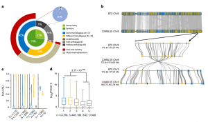 基因共線性反映了不同基因組間的基因含量及其在染色體上的排列。CIMBL55與B73基因組之間的共線基因分析表明,73%的CIMBL55基因位于共線基因塊,27%的基因是非共線基因。共線基因進一步可以分為三類。1類基因(42%)位于B73和CIMBL55的同源染色體上,多數為單拷貝基因(one-one syntenic)。2類基因(29%)是位于各自基因組中兩條不同同源染色體上的重復基因(multi–multi synteny)(圖2b)。3類基因(2%)位于CIMBL55當前組裝中未定位到染色體上的contigs中,但與B73中的相應基因處于共線性塊中。非共線基因包括class 4(16%)和class 5(11%)2類基因。