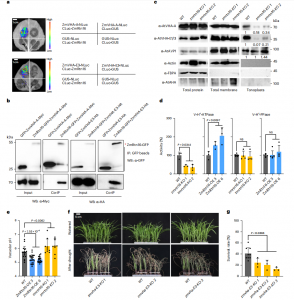為了解ZmRtn16的生物學功能,亞細胞定位分析發(fā)現ER標志物與ZmRtn16-GFP融合蛋白共定位在ER中,表明ZmRtn16-GFP在ER中發(fā)揮作用。免疫共沉淀(co-IP)顯示ZmRtn16能與液泡膜H+-ATPase復合體A (ZmVHA-A)和E3亞基?(ZmVHA-E3)相互作用。隨后,通過比較zmrtn16-crispr和WT株系的ZmVHA-A和ZmVHA-E3亞細胞定位,發(fā)現ZmRtn16可以促進ZmVHA-A和ZmVHA-E3的液泡膜定位(圖6c)。此外,與WT植物相比,ZmRtn16-OE株系液泡質子泵活性較高,而ZmRtn16-KO株系液泡質子泵活性較低(圖6e),突出了液泡質子泵在抗旱性上的作用。綜上所述, CIMBL55基因組中ZmRtn16基因3′ -UTR中28 bp缺失,可能增強ZmRtn16的表達,促進了ZmVHA-A和ZmVHA-E3在液泡膜中的定位,從而提高玉米的抗旱性。