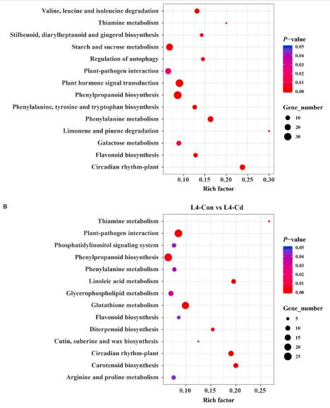 為了了解差異基因的功能,作者進(jìn)行了GO富集分析。四組的差異基因在節(jié)律過程、信號傳導(dǎo)和代謝過程等生物過程中都有20個(gè)豐富的分類。值得注意的是,與對照組相比,脫毒組的差異基因在幼葉和衰老葉中都有富集(L1-ConvsL1-Cd和L4-ConvsL4-Cd),但在幼葉和衰老葉的對照組和處理組中沒有明顯富集(L1-CdvsL4-Cd和L1-ConvsL4-Con)。