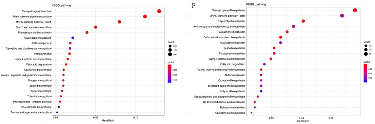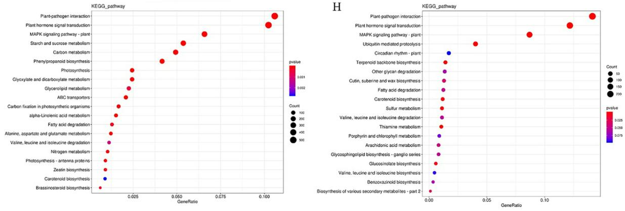 圖2:A-D:RvsS的DEGs在生物過程、細胞成分和分子功能中的GO富集圖;E-H:R與S的DEGsKEGG富集點圖(注:A:RCKvsRCa;B:RCavsSCa;C:SCKvsSCa;D:RCKvsRCavsSCKvsSCa中R特異性表達的DEGs;E:RCKvsRCa;F:RCavsSCa;G:SCKvsSCa;H:R-RCKvsRCavsSCKvsSCa中特異表達的DEG。)