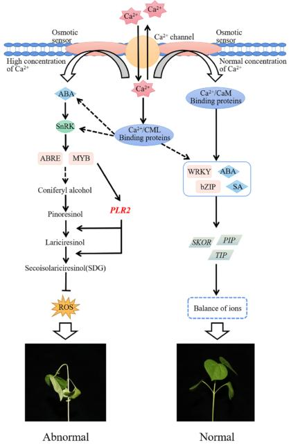 當Ca2+從細胞外或液泡涌入細胞質時,細胞質中的Ca2+濃度會增加,Ca2+會與一些Ca2+受體蛋白CaM和CML結合,形成Ca2+/CaM(CML)結合蛋白。激活的Ca2+信號導致一些下游轉錄因子的表達增加,如WRKY和bZIP,通過調節(jié)細胞內(nèi)外水和離子的平衡,細胞在傳遞Ca2+信號后可以迅速恢復到低濃度Ca2+環(huán)境的狀態(tài)。同時,一些激素也受Ca2+信號的調節(jié),如ABA和SA,可以緩解棉花中的Ca2+瞬變。當植物暴露于高濃度的Ca2+時,它們再也不能抵抗單獨由通道蛋白引起的大量Ca2+造成的損害。R將通過ROS清除機制與通道蛋白形成復雜的調節(jié)網(wǎng)絡,共同緩解高Ca2+應激。滲透受體感應到Ca2+的增加,然后調節(jié)ABA的合成,激活ABA信號通路。首先,增加的ABA與PYL蛋白結合并與PP2C相互作用,通過SnRK促進一些下游因子的磷酸化,并啟動ABA信號反應。此時,編碼PLR2的轉錄因子ABRE和MYB被激活。然后,通過促進松脂醇合成落葉松烯醇,落葉松烯醇合成SDG,從而提高活性氧的清除能力,從而增強棉花抵御高Ca2+脅迫的能力(圖4)。