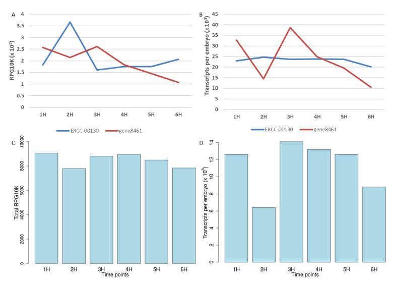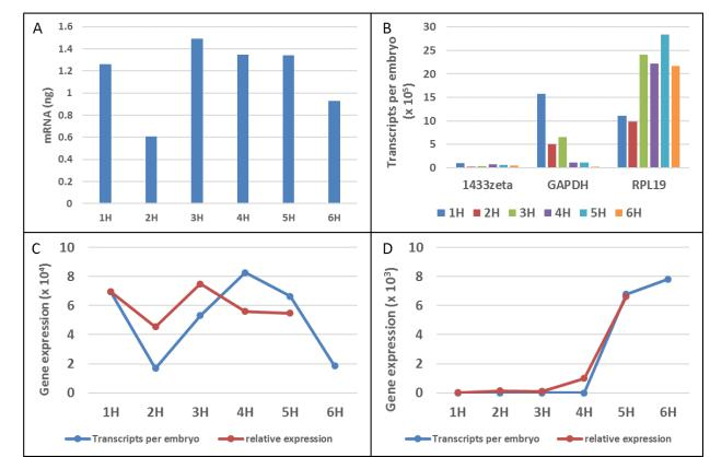 通過將每個(gè)胚胎的每個(gè)基因的所有轉(zhuǎn)錄物相加并計(jì)算以毫微克計(jì)的當(dāng)量來計(jì)算每個(gè)胚胎的總mRNA(圖3A),總mRNA在1hpo時(shí)從1.2ng/胚胎下降至2hpo時(shí)為0.61ng/胚胎,然后在3hpo時(shí)增加至1.49ng/胚胎,然后在6hpo采樣結(jié)束時(shí)降至0.93ng/胚胎,反映了每個(gè)胚胎的總轉(zhuǎn)錄本(圖2D)。假設(shè)2-5%的總RNA是多腺苷酸化的,mRNA水平與我們在每個(gè)胚胎中獲得的總RNA產(chǎn)量一致。