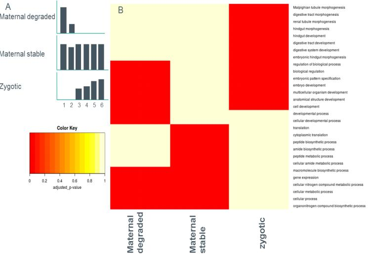 我們對(duì)3個(gè)類別基因集進(jìn)行富集分析;母體降解基因,受精卵基因和母體穩(wěn)定/上調(diào)基因。母體降解基因也是1hpo中表達(dá)高的基因,富含細(xì)胞過程,發(fā)育和新陳代謝(圖6)。母體降解的基因也富含轉(zhuǎn)錄因子,例如DREF,BEAF-32A,PNR,它們是相應(yīng)的果蠅同源基因。類似母體降解基因,母體穩(wěn)定/上調(diào)基因在翻譯,生物合成過程,基因表達(dá),代謝過程等方面得到豐富,反映了快速生長胚胎的高代謝活性,DREF轉(zhuǎn)錄因子也在這些基因中富集。受精卵基因富含特定的組織形成和發(fā)展過程,包括:后腸發(fā)育,模式規(guī)范,消化道形態(tài)發(fā)生等功能。