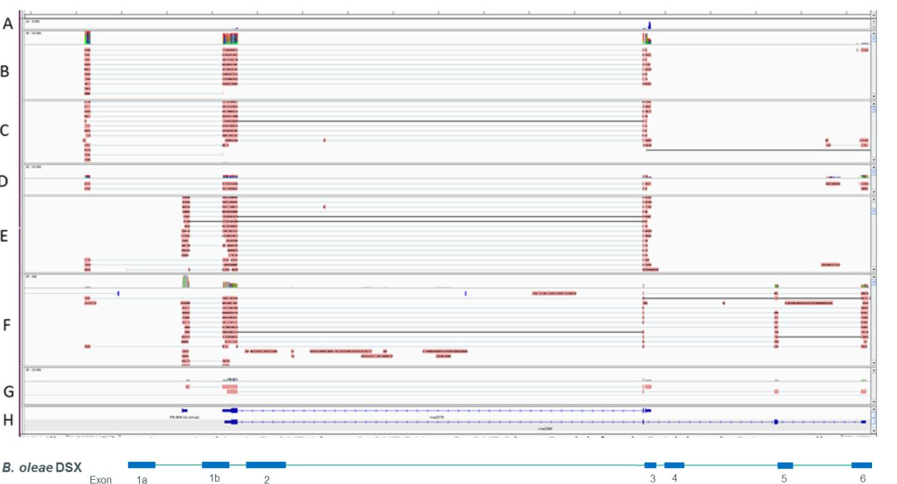 雙翅目昆蟲的性別決定機(jī)制在很大程度上是相同的,在果蠅(Drosophilamelanogaster)中,性別決定機(jī)制已被廣泛研究,性致死基因(sxl)作為主要調(diào)節(jié)因子,根據(jù)性染色體與常染色體的比例,調(diào)節(jié)本身和變異基因(tra)的性別特異性選擇性剪接。tra反過來調(diào)節(jié)性別特異性雙重性別的選擇性剪接(dsx),這是級(jí)聯(lián)的最后一個(gè)成員和性別差異發(fā)育的中介。B.oleae同源物已經(jīng)鑒定了sx1,tra和dsx。然而,主要的調(diào)控方式仍然難以捉摸。已經(jīng)提出橄欖蠅的性別決定在胚胎發(fā)育的前6小時(shí)內(nèi)發(fā)生,并且通過類似于黑腹果蠅中的性別決定機(jī)制的tra和dsx的可變剪接來調(diào)控。在轉(zhuǎn)錄組數(shù)據(jù)中,我們能夠觀察到tra和dsx的各種可變剪接。使用來自成年雄性和雌性頭部的數(shù)據(jù)來識(shí)別性別特異性亞型。在dsx的情況下,與成齡相比,早期發(fā)育階段的亞型復(fù)雜性顯著不同。在數(shù)據(jù)中,看到具有不同轉(zhuǎn)錄起始位點(diǎn)和長度較長的亞型,因?yàn)樵诎l(fā)育的早期胚胎階段存在突出的亞型(圖8),成齡頭部組織中的這些亞型轉(zhuǎn)移到較短的亞型中,外顯子4存在于雌性中但不存在于雄性中。由于我們無法在早期胚胎階段檢測到這些性別特異性亞型,我們認(rèn)為它們的表達(dá)在發(fā)育過程后期開始。然而,它們在后期階段的積累代表了在發(fā)育早期階段激活的性別調(diào)控系統(tǒng)。北京百邁客生物科技有限公司。
